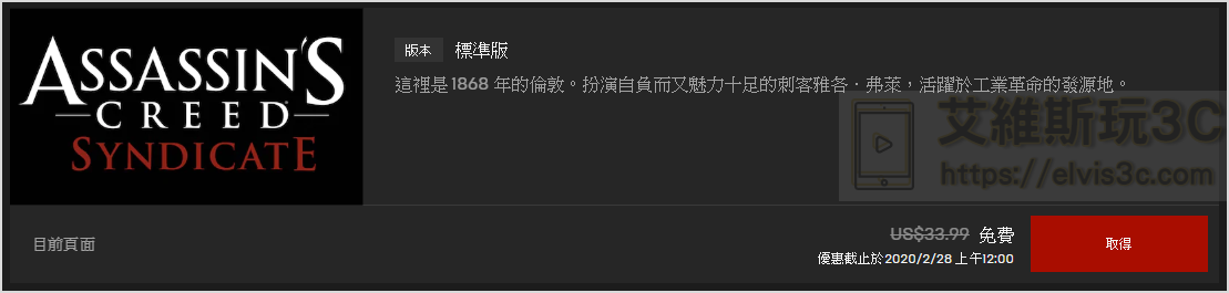 刺客教條梟雄限時免費總算等到你了,知名數位遊戲平台EPIC經常推出免費的遊戲供會員索取,這次居然提供了這款大作,也就是「Assassin’s Creed Syndicate」,這次的限時免費下載提供到2/28日止,喜歡刺客教條的朋友可別錯過了。