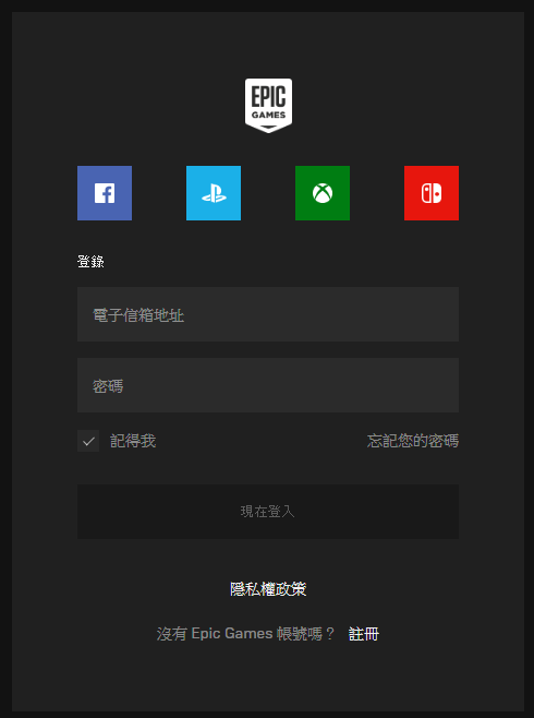 ▼ 在這裡會要您進行EPIC平台的帳號登入,您可以選擇臉書、PSN或XBOX、NS等帳號都可以連動登入,我個人是選擇臉書,如果都不想的話,可以選擇註冊EPIC平台的專屬帳號。