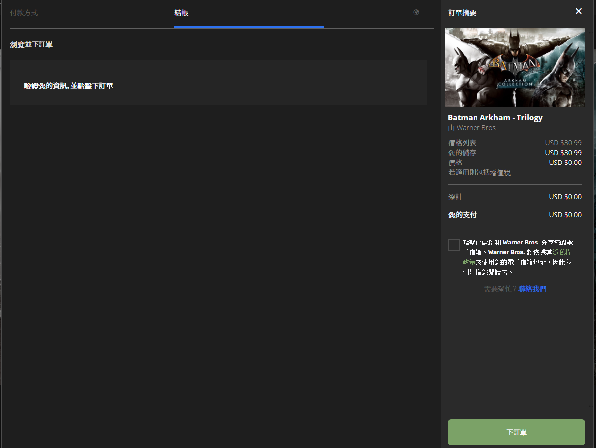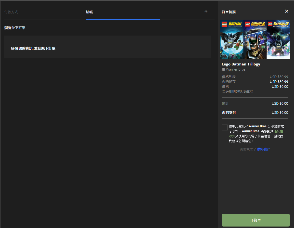 ▼ 登入後就能繼續進入結帳的畫面,大家應該可以看到原價是要30.99的蝙蝠俠直接0元贈送,接著點擊右下角的下訂單即可完成。