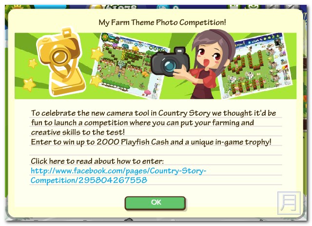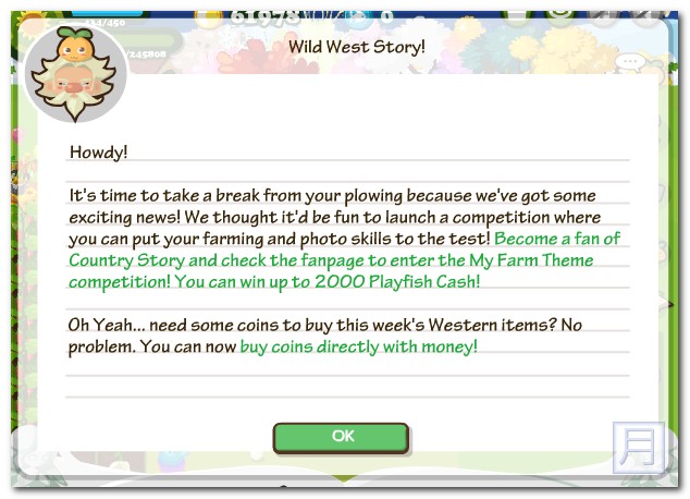 Country Story 01/29 更新,美國西部主題登場,趕快把您的農場裝扮成西部風格吧,另外 PlayFish 舉辦了一個農場拍照活動,只要您的農場有主題性的佈置,都能拍下農場的照片,PlayFish 將會選出最有創意的農場佈置主題,送出免費的魚幣,最大獎可以得到2000的魚幣唷,有興趣的可以參加。
