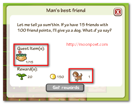 ▼ 任務的需求是必須與15位朋友達到100點的友誼值,而較重要的獎勵就是狗狗囉。