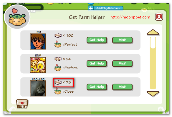 ▼ 預設的友誼值是75點,除非您有使用「Get Help」請朋友幫您照顧作物,不然是不會減少的,請找出您不足100點的15位朋友。