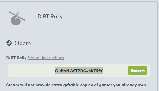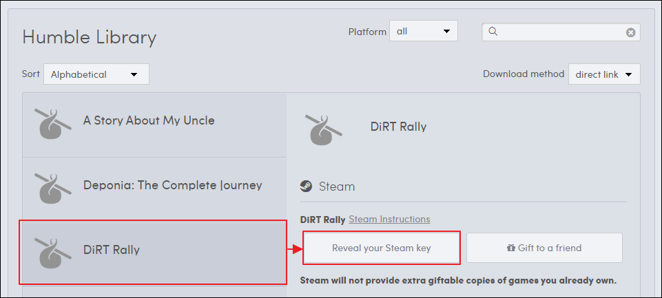 ▼ 在這裡請選擇左邊的遊戲清單中的「DiRT Rally」,若找不到可以再重新整理,接著點擊右邊的 Reveal your Steam Key 取得您的轉移序號。