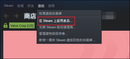 ▼ 再到 Steam 的遊戲平台介面中點擊遊戲功能表,再選擇在 Steam 上啟用產品的選項。