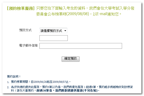 預約方式其實很簡單,它提供兩種預約方式,一種為考生姓名,另一種為準考證號碼,我是建議用準考證號碼會比較好,因為姓名相同的機會太多了,如果對到別人的榜單白高興一場也是很麻煩的,所以建議您使用準考證號碼做為查詢的依據,再來就是留下您的電子信箱,按下確定預約後就算大功告成了,只要靜待系統寄發榜單給您就可以了,預約榜單的期間只有到 2009/08/07 為止,如果您想放榜當天再查詢當然也是ok的,您可以使用「歷年大學查榜系統」進行查詢,不過要等到 2009/08/08 08:30 後才能使用。
