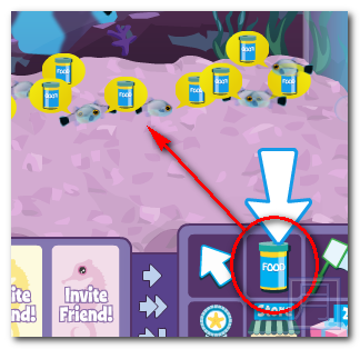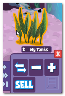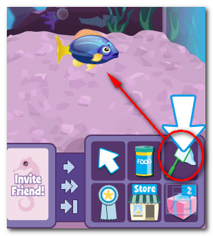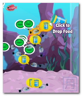 ▼ 選擇飼料工具後,在魚缸內點擊左鍵倒下飼料,把有出現飼料圖樣的魚餵到出現綠色笑臉即可。