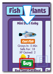 ▼ 導引模式只能買這種魚,「Fast Fish」是代表生長速度極快的魚,收成的報酬率是一般魚的數倍,但餵食時間短,要細心照顧,一不小心沒餵魚就會翻肚給你看了。