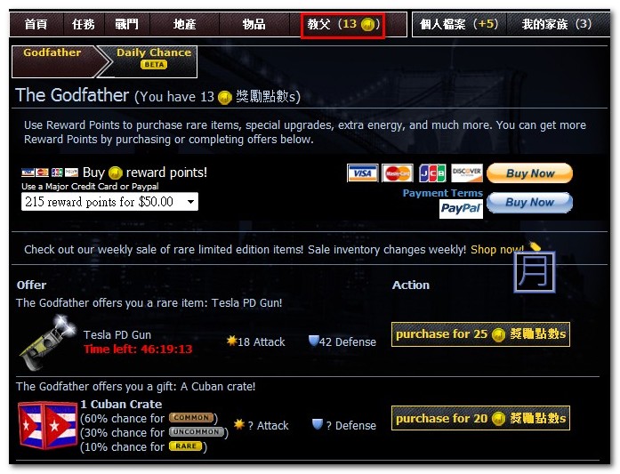 ▼ 等級七時會可以取得「教父」的功能,教父的功能是提供您使用獎勵點數換取各種不同的獎勵品,內容像是稀有道具、神秘箱、能力點數與金錢等等,而完成相關的成就可以獲得獎勵點數,成就後面會再介紹,如果您想快速獲得獎勵點數也能透過 Paypal 或信用卡來取得,看您捨不捨得花而已。