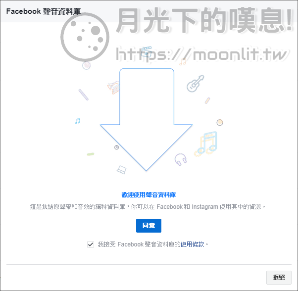 ▼ 進入聲音資料庫後會先告知您使用的條款有哪些,基本上用這些素材所製作出來的影片只能上傳至Facebook與Instagram的平台上,所以在使用上會有些限制,請大家先閱讀一下。