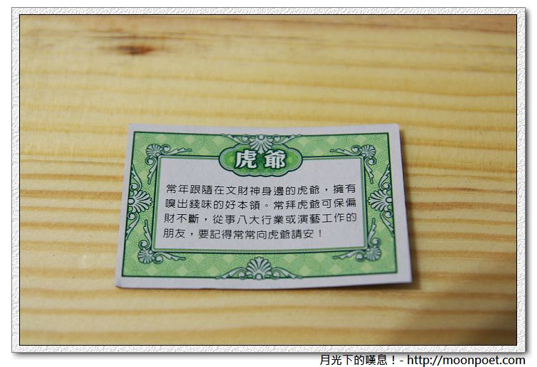 ▼ 虎爺:常年跟隨在文財神身邊的虎爺,擁有嗅出錢味的好本領。常拜虎爺可保偏財不斷,從事八大行事或演藝工作的朋友,要記得常常同虎爺請安!