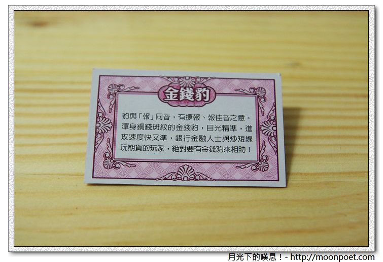 ▼ 金錢豹:豹與「報」同音,有捷報、報佳音之意。渾身銅錢斑紋的金錢豹,目光精準,進攻速度快又準,銀行金融人士與炒短線玩期貨的玩家,絕對要有金錢豹來相助!