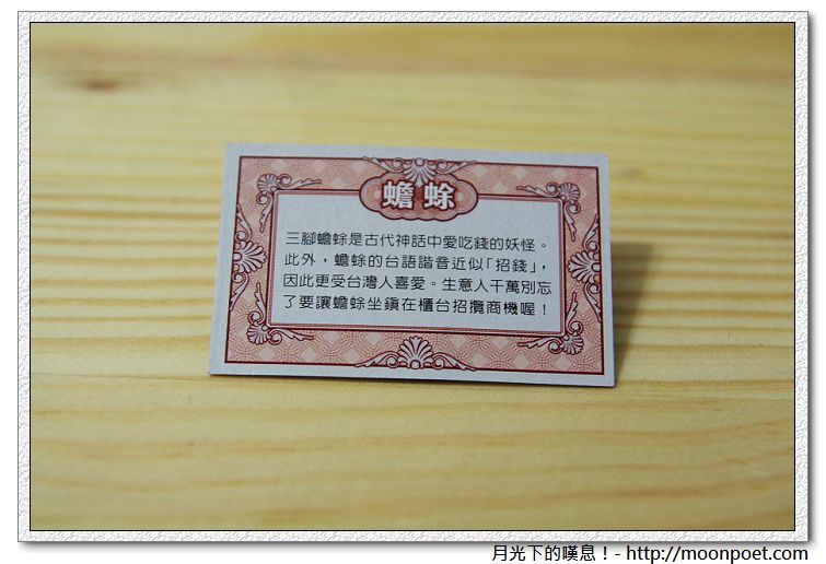 ▼ 三腳蟾蜍:三腳蟾蜍是古代神話中愛吃錢的妖怪。此外,蟾蜍的台語諧音近似「招錢」,因此更受台灣人喜愛。生意人千萬別忘了要讓蟾蜍坐鎭在櫃台招攬商機喔!
