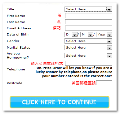 ▼ 再來我用其中一個任務的表單來解釋一下,通常表單要您填入的無非是姓名、信箱這類的資料,再來較難的就是要輸入英國的電話與英國的郵遞區號或住址。