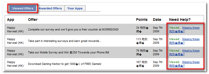 ▼ Viewed Offers 中的列表就是代表您執行過的任務,如果在「Need Help?」的欄位中出現「Viewed…」的綠字就代表失敗了,請再找下一個任務執行。