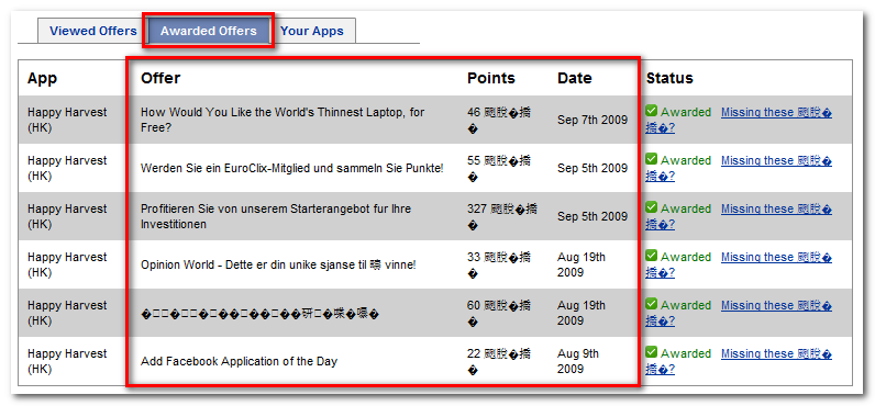 ▼Awarded Offers 的列表是告訴您已經成功並取得農民幣的項目,點圖可以放大,這些都是我成功取得農民幣的項目,可以在Date中很清楚看到我昨天也有取得。