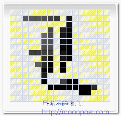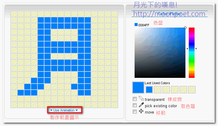 ▼ 這是主要的編輯畫面,您可以自由在上面發揮創意,「transparent」是用來消除畫錯的地方、「pick existing color」是用來吸取顏色、「move」則是可以用來移動畫過的格子。