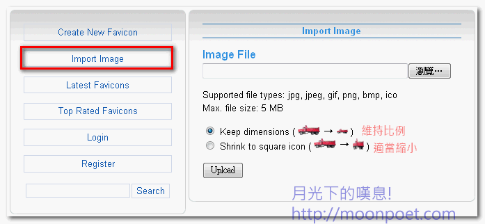 ▼ 接著教您如何輸入影像做為圖示,請先點選「Import Image」的按鈕,接著在右手邊的「Image File」按下瀏覽選取您的影像檔案後按下「Upload」即可,檔案限制為 5 MB 以下,格式支援「jpg、jpeg、png、bmp、ico」。