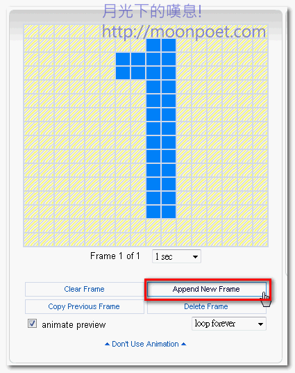 ▼ 接著就是製作動畫版的圖示,點選在編輯器下方的「Use Animation」按鈕展開動畫圖示功能,此時您可以按下「Append New Frame」增加新的畫格。