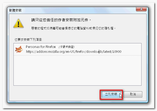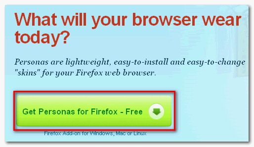 ▼ 使用火狐瀏覽器開啟上方連結,點擊「Get Personas for Firefox – Free」按鈕進行安裝。