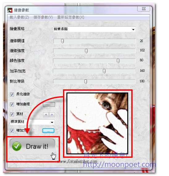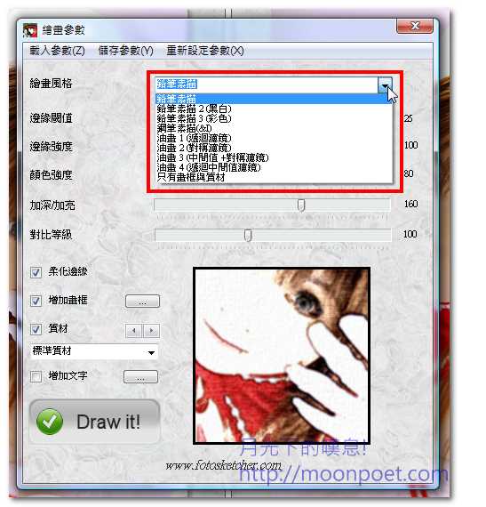 ▼ 開啟檔案後會跳出繪畫參數的設定視窗讓您作更改,先選擇您的繪畫風格,有素描和油畫等等的效果可供選擇。