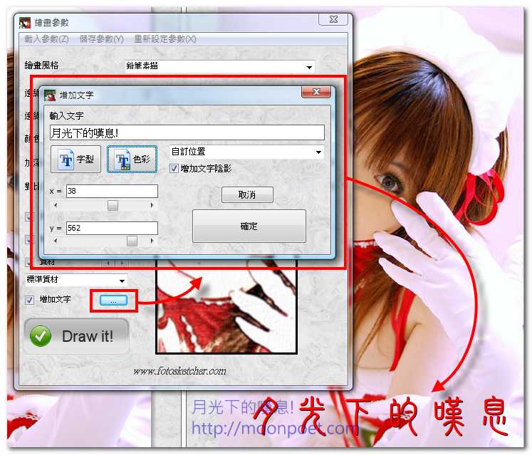 ▼ 要增加文字當然也不是件難事,點選增加文字就能讓您自由增加您想加入的文字,右手邊的對照圖會即時顯示文字的效果。