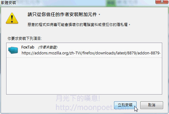 ▼ 先至 FoxTab 的安裝頁面進行安裝,請點擊「安裝到 Firefox」。