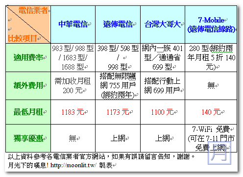 這幾家電信龍頭將網內互打免費資格門檻定的有點高,想要用三大電信業者的網內免費,至少每月都要花1千元以上的月租費,有些甚至還要綁約3G上網,可不是3百多就能網內互打吃到飽,但換句話說,品質是一定能保證的,畢竟是最大的三間業者,大家就看看自已的需求再決定是否要使用這樣的服務囉,以下就為各位整理網內互打免費2011年的費率分析表。