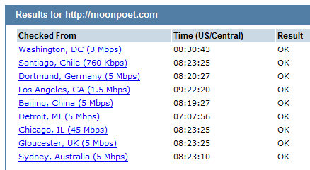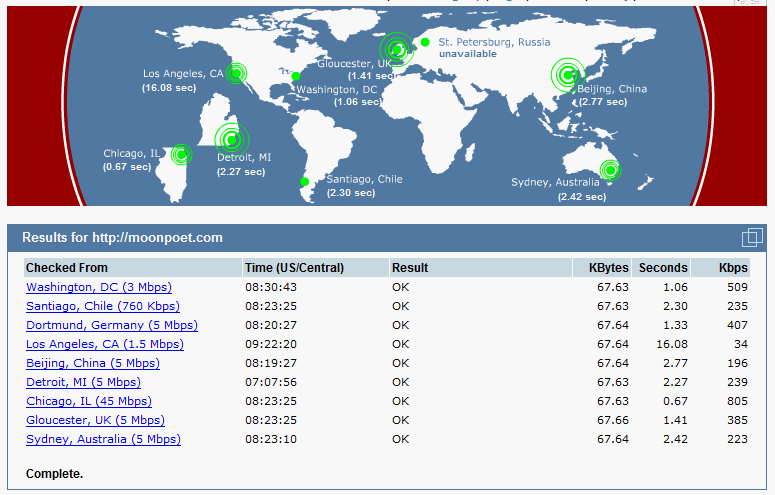 FreeSpeedTest.com 是一個用來測試網站在世界各地連線速度的服務,您只要輸入您想測試的網址就能測試在世界各地連到網站的速度,而且可以順便測試該國是否有封鎖該網站的ip,像中國就有封鎖噗浪的ip,我測了一下果然在大陸北京是連不上噗浪的,這代表您也可以順便測試您的網站是否有被封鎖唷。