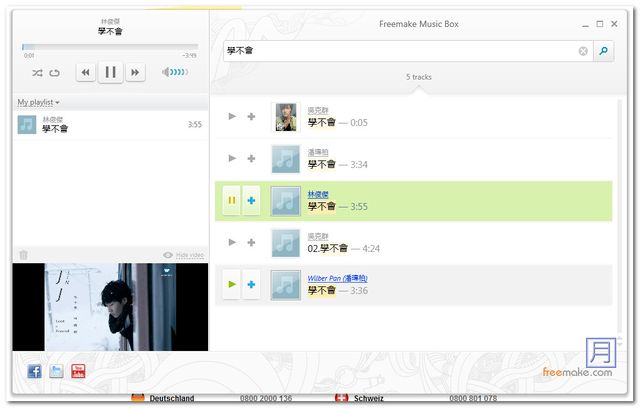 Freemake Music Box 是一套非常好用的免費聽歌軟體,它提供一個龐大的音樂資料庫,而且完全支援中文,我們只需透過搜尋列就能輕鬆的找到自已喜歡的音樂,就像KKBOX、ezPeer那樣,透過網路直接收聽,比較可惜的是它只能在軟體中聽,無法下載到電腦裡,另外值得一提的是它同時結合 Youtube,讓我們在聽歌的同時也能看MV。
