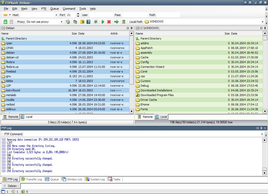 FTP Rush 是一個運行在微軟視窗平台的高性能 的FTP軟體 客戶端,同時它也是一個優秀的FXP的客戶端,而且它是完全免費的!不僅如此,它還完美支持SFTP發布協議和TFTP的協議,您可以使用的FTP拉什來進行文件上傳下載和服務器對服務器傳輸。FTP Rush 支持完全的界面自定義,您可以定制出您喜歡的界面佈局和風格,您還可以通過內置的腳本功能您還可以輕鬆地製作自動化任務。