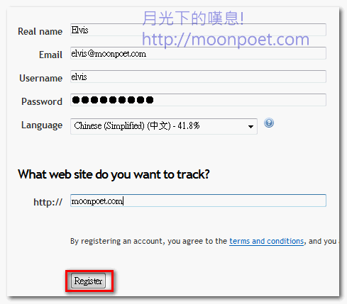 ▼ 填入相關資料,Real name(真實姓名)、Email(電子信箱)、Username(登入帳號)、Password(登入密碼)、Language(所在語系),並在最下面填入您的網站網址。