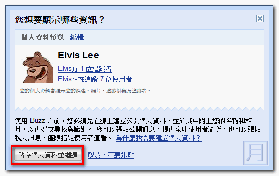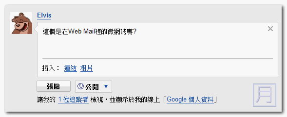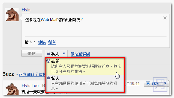 ▼ 若使用公開模式也會將您所發佈的「Buzz」訊息張貼至您的 Google 個人資料中。