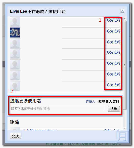 ▼ 在列表中您可以變更已追蹤對象的狀態,或在圖框2中自行加入、搜尋新的使用者作為您的追蹤對象。