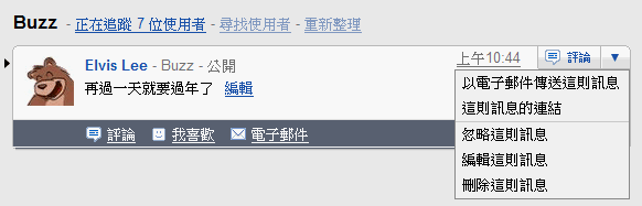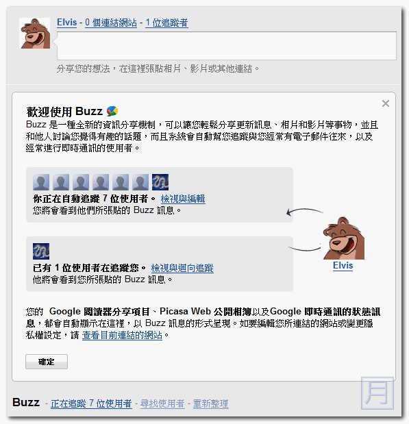 ▼ Buzz 一開始就會先幫您加入一些您常在往來的聯絡人作為追蹤的對象,但人數仍少的可憐,您可以點擊「正在追蹤使用者」的連結,自行加入新的使用者或是變更對其他使用者的追蹤狀態。