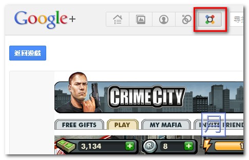 ▼ 之後您只需要點擊 Google+ 的遊戲圖示(圖中紅框所示),就能切換到遊戲的主頁面。