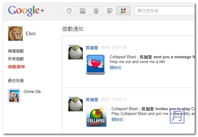 ▼ 包含遊戲的各種通知訊息都會在這頁裡顯示,再也不會像 Facebook 中那樣,老是看到一些遊戲訊息混在自已的塗鴨版中,非常討厭。