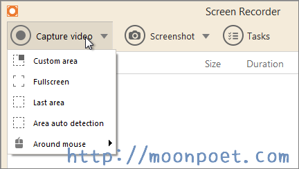 ▼ 軟體介面只有英文,Capture video 是畫面錄影,而Screenshot是擷圖功能,Custom area 是自訂錄製區域、Fullscreen 是全螢幕、Last area 則是最上方的視窗畫面、Area auto detection 是自動偵測視窗畫面進行錄製。