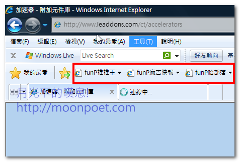 ▼ Internet Explorer 8 提供了六種 FunP推推王 的加速器供大家使用。