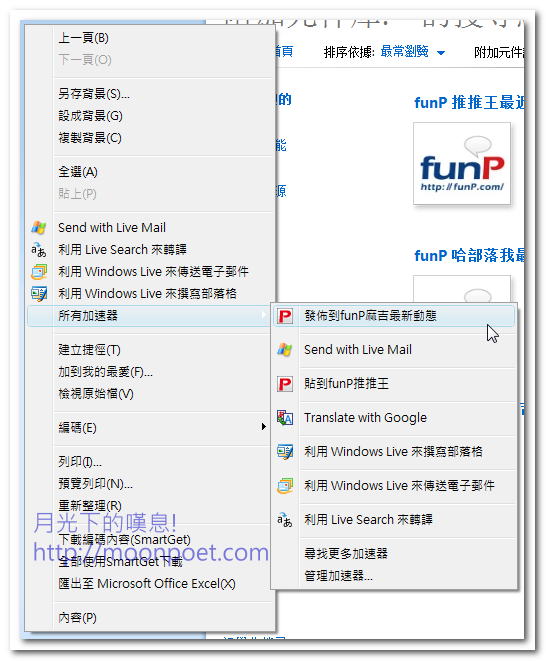 ▼ 另外裝上了推文的套件,可以讓您把喜愛的文章貼到 FunP推推王 更省時唷,在您想推的網頁上按下右鍵 >> 所有加速器 >> 貼到FunP推推王。