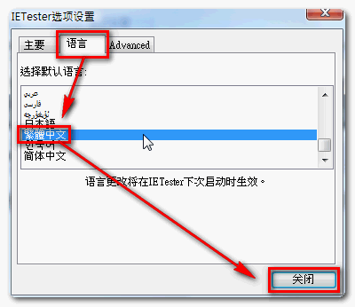 ▼ 將頁籤選至「語言」後選擇繁體中文,然後重新啟動IETester。