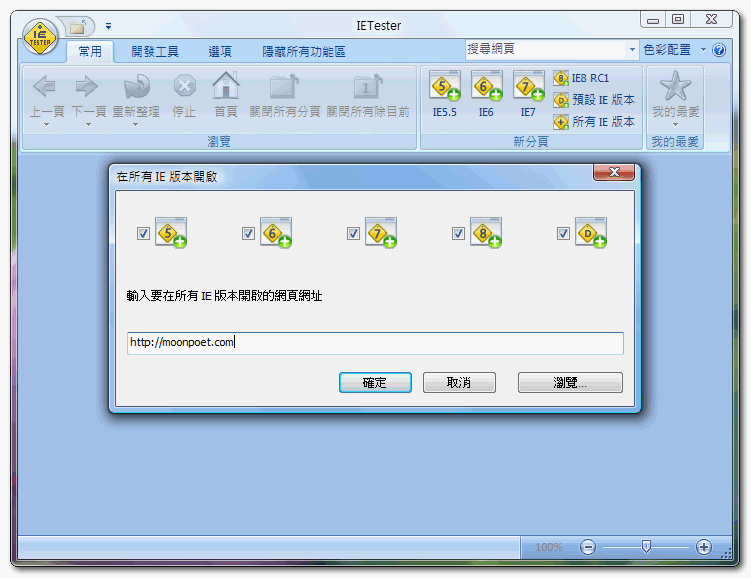 IETester 是一款讓您用來測試網頁在各版本IE瀏覽器中的顯示效果測試工具,讓您能抓出網頁在不同版本的IE中所會產生的問題,是網頁設計師必備的軟體,因為使用IE瀏覽器的網頁訪客仍屬大宗,而且 IETester 目前已支援 IE 5.5 ~ IE 10 的模擬瀏覽環境了。