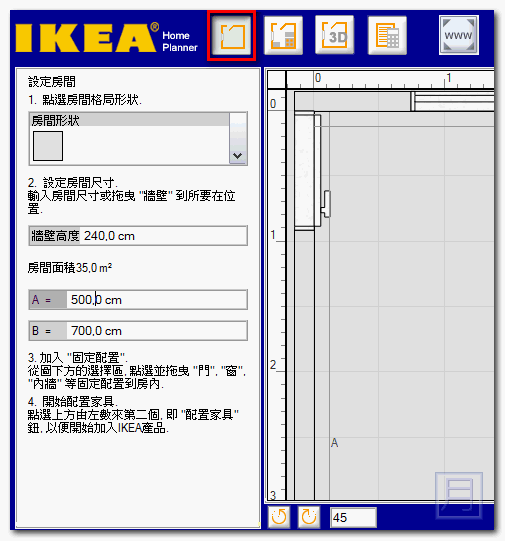 ▼ 將軟體安裝後開啟它,首先第一步是設定房間大小、形狀,完成後請按上面第二個圖示。