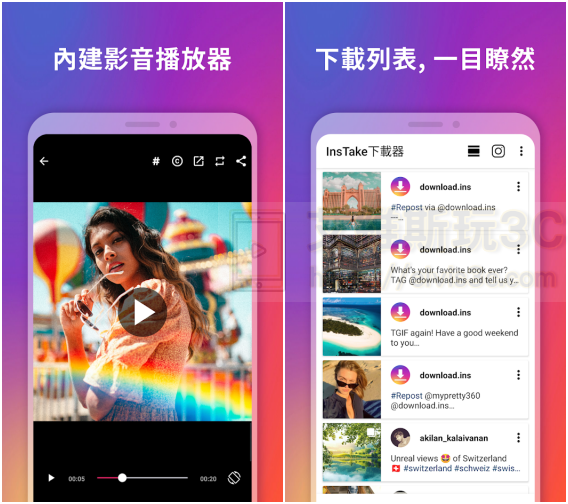 Instagram 是許多人喜愛分享照片與影片的社群平台,尤其是許多網紅正妹都喜歡用 Instagram 來推銷自己,所以 Instagram 也成為眾網美們的集散地,有時看到一些不錯的影片與照片想要收藏在自己的手機裡該怎麼做才好呢? 其實我們只需要一個APP就能搞定,那就是 InsTake 這款Instagram影片下載工具,它提供我們能用來將 Instagram 上的影片與照片直接下載,更重要的是它不需要登入就能直接下載。