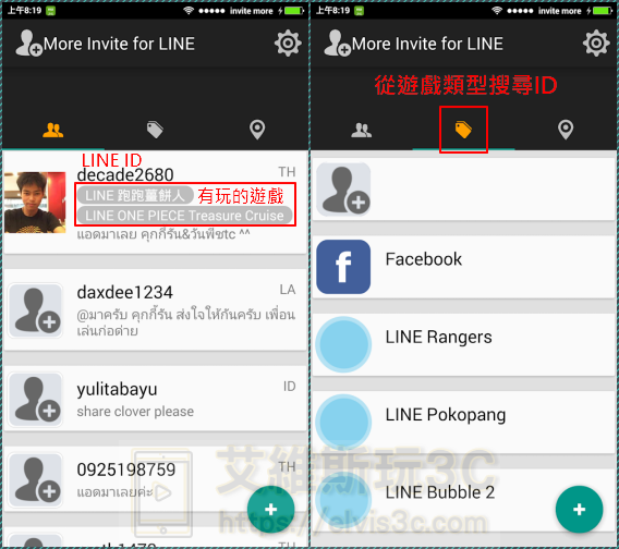 ▼ 我們下載APP後就能直接看到一大票的LINE ID,裡面會標註這個人有玩什麼遊戲,基本上您能複製ID,直接用加ID的方式將他們加入你的好友,當然您也可以從第二個頁籤中從遊戲類型去過濾您想加的好友,但不知道是不是有效(活躍)帳號可能就要看運氣了。