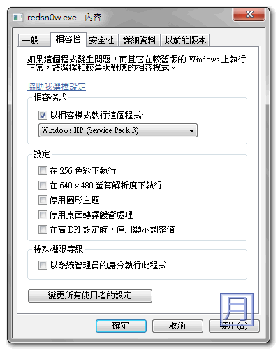 ▼ 如果您的作業系統是Win7或Vista,請先將redsn0w的相容性改至WinXP SP3。