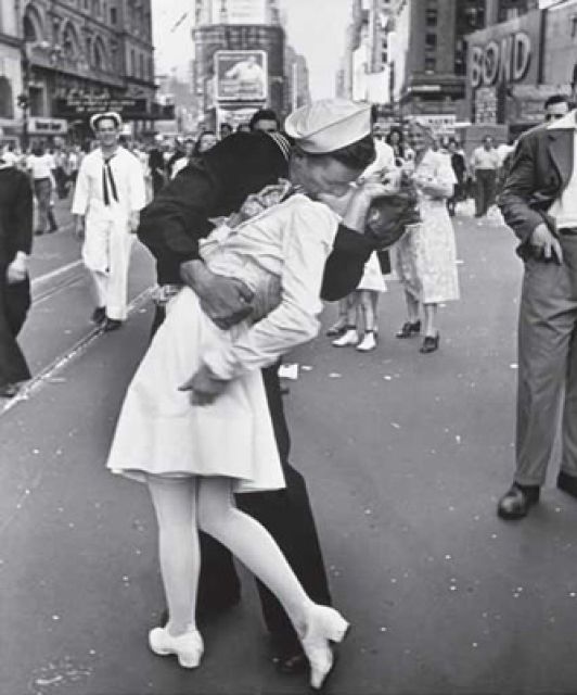 ▲ 二次大戰日本投降之慶祝遊行,一名軍人當眾親吻年輕女子