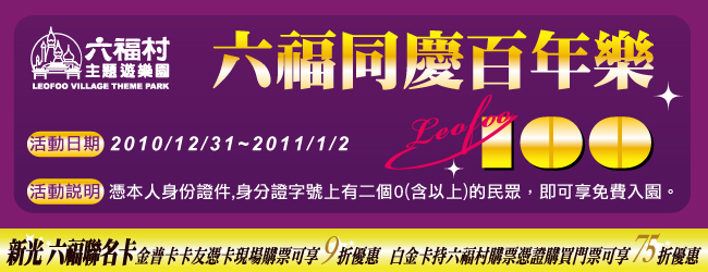 建國百年的那天即將到來,各大企業與公司也都推出各種迎接建國100年的相關活動與優惠資訊,艾維斯 今天收到一封 E-mail 得知六福村主題樂園為了慶祝建國百年的日子,在 2010/12/31~2011/01/02 這三天開放讓身份證字號中有兩個0以上的民眾免費入園,真是太佛心了,可惜的是 艾維斯 不符資格,趕快檢查您的身份證字號是否符合資格吧,順便在那幾天的週六與週日帶家人一同去放鬆心情。