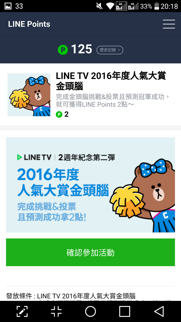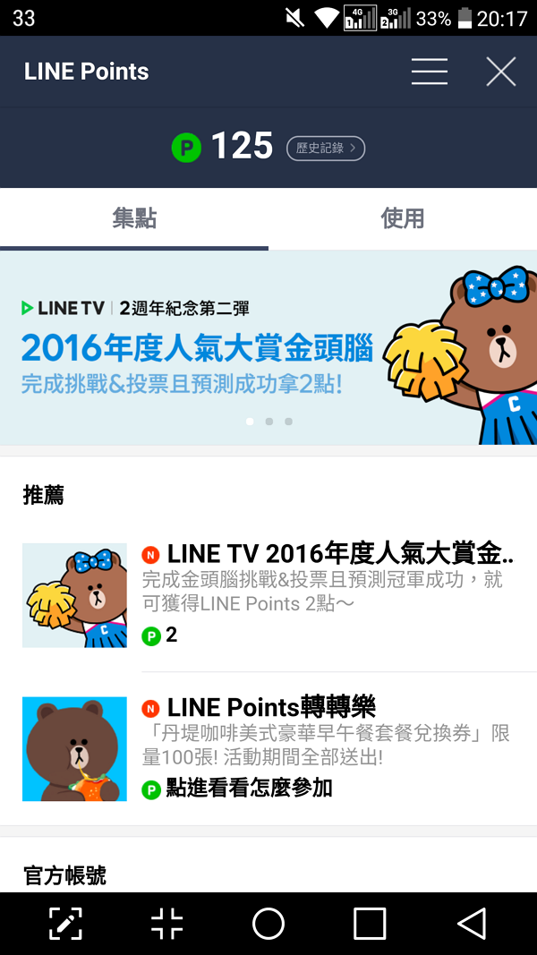 ▼ 點擊綠色的P幣圖示就能進入任務列表,在這裡就能看到今天才上架的2016年度人氣大賞金頭腦問答題。