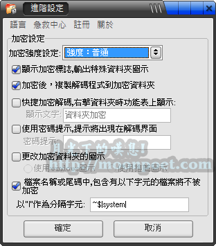 加密方式:★★★★★ 使用256位元的 Blowfish 算法完全加密 ( 適用於極密的檔案 )