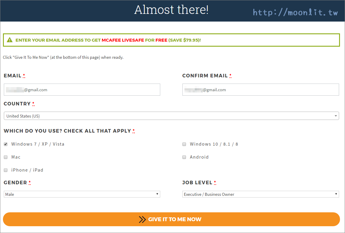 ▼ 上面EMail就輸入您的Mail兩次,其他的隨便選就行了,完成後按橘色按鈕繼續。